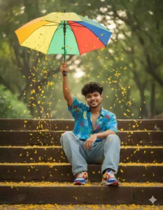 Hyperrealistic photo of a stylish man with a modern hairstyle, wearing a blue print half-sleeve oversized linen shirt and baggy denim pants with Nike colorful sneakers, sitting on stone steps outdoors. He is holding a vibrant colorful umbrella high above his head with one arm raised, looking at the camera. Bright yellow flower petals are cascading all around him, creating a magical, celebratory effect. The background is softly blurred with hints of lush greenery.