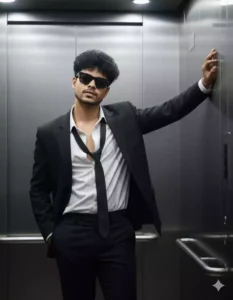 Use this face and create an ultra hyper-realistic 8k resolution portrait standing in a lift with a black suit and white unbuttoned shirt with an undone tie. Wearing black sunglasses, he leans against an elevator wall — one arm on the wall and the other in his pocket, turning his head slightly with confidence. Keep the same face.